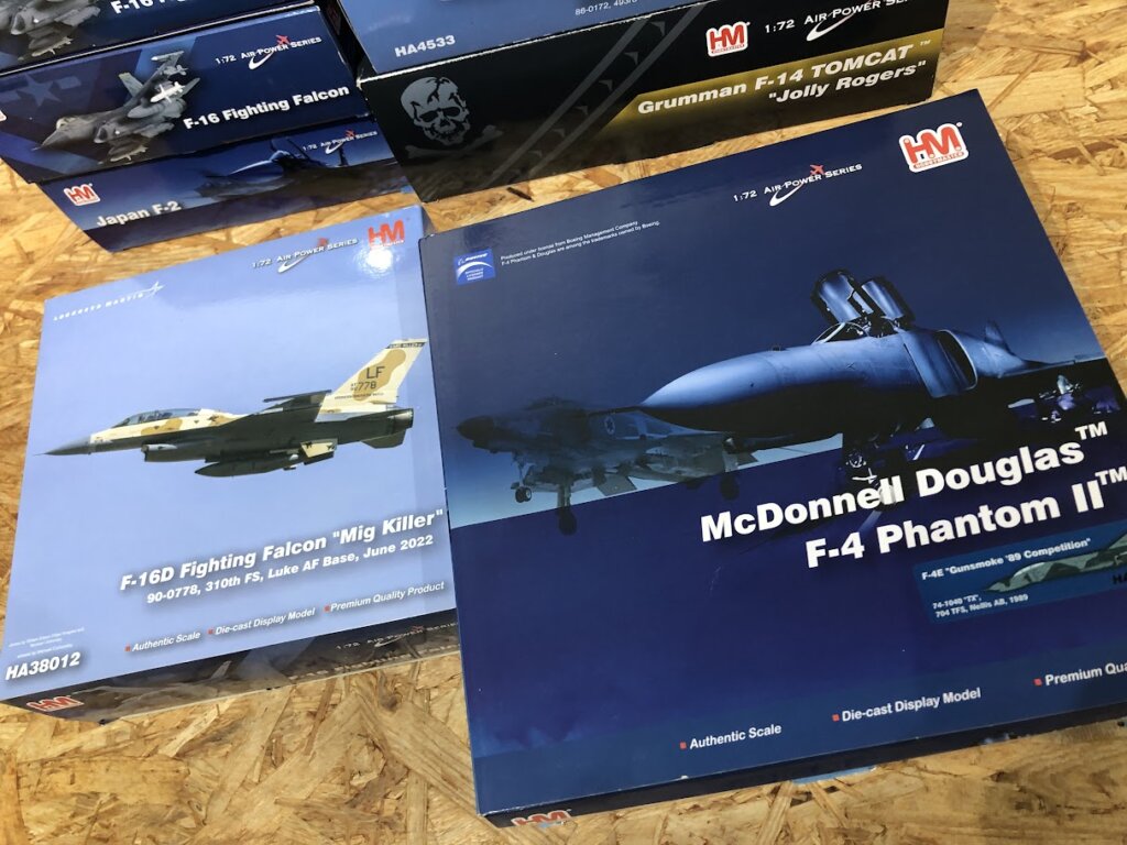 今回お預かりしたのは、圧倒的人気を誇るF-14トムキャット「ジョリーロジャース」をはじめ、日本の空を守るF-2戦闘機、さらにはF-15C、F-16、F-4ファントムII、EA-18Gグラウラーといった、航空ファン垂涎のラインナップです。ホビーマスターの魅力は、なんといってもダイキャスト製ならではの重量感と、実機を忠実に再現した精密なディテール。箱の状態で大切に保管されていたことが伝わる、非常に状態の良いコレクションでした。