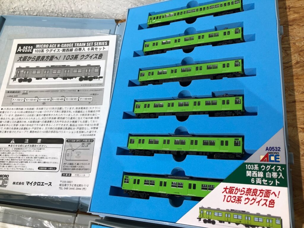 この度、鉄道模型ファンに根強い人気を誇るマイクロエース(MICRO ACE)のNゲージ、A-0939+増結で「203系-100番台 追加で10両フル編成」とA-0532「103系 ウグイス・関西線 白帯入 6両セット」をお譲りいただきました。