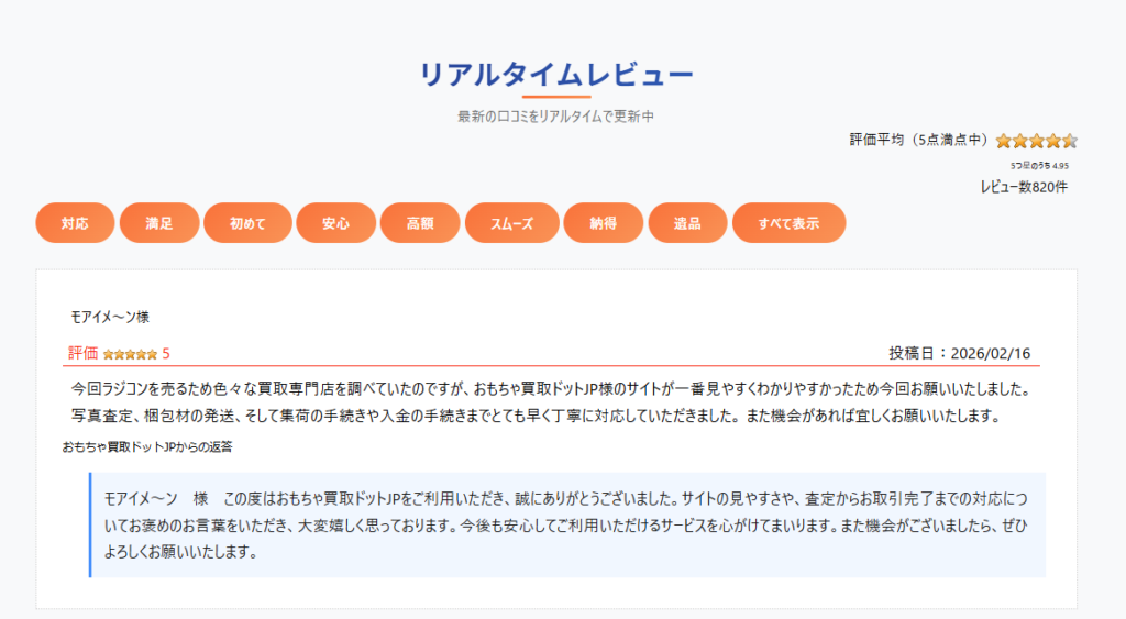 ※レビューの引用元:おもちゃ買取ドットJP自社レビューページ、ヒカカク(hikakaku.com)、Googleレビュー