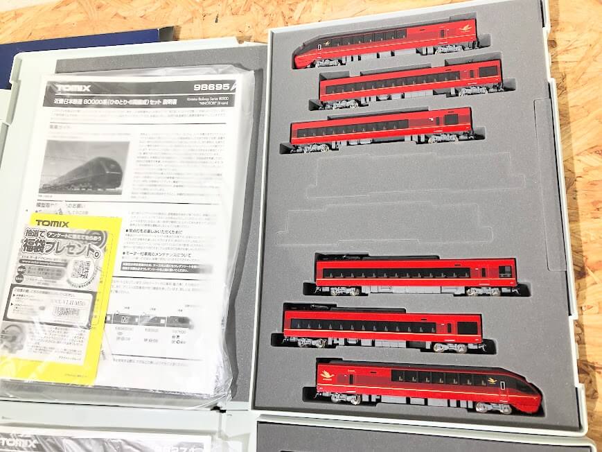 どちらも非常に状態が良く、特に「ひのとり」はその特徴的なメタリックレッドの塗装が美しく保たれていました。近鉄の次世代特急として君臨する「ひのとり」の6両編成セット(型番:98695)は、模型の世界でもその存在感は圧倒的です。一方の「キハ66・67形 九州色」(型番:98271)も、白地に青のラインが映える九州地方お馴染みのカラーリングが忠実に再現されており、説明書や付属品も揃った素晴らしいコレクションでした。オーナー様がこれまで大切に扱われてきたことが、箱を開けた瞬間の整然とした佇まいから伝わってきました。